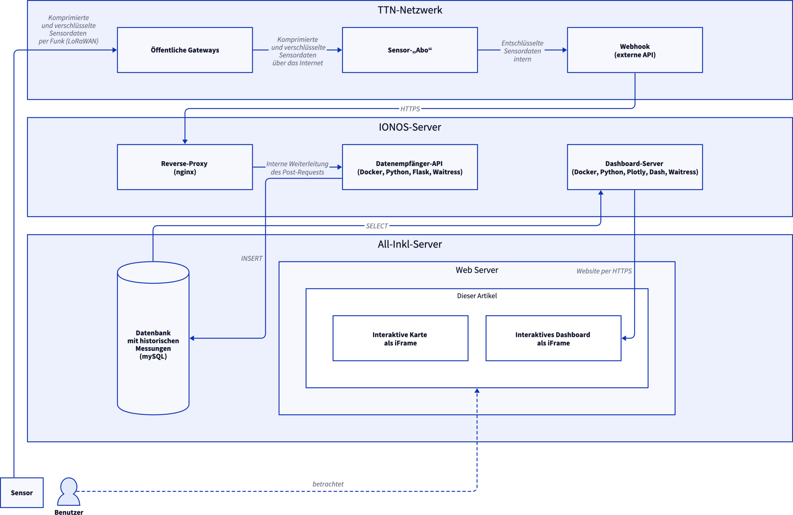 Die Programmierung selbst war dabei eher der leichtere Teil. Die eigentliche Herausforderung war die Infrastruktur: Daten empfangen, speichern, abrufen und darstellen – verteilt über mehrere unabhängige Server, die miteinander kommunizieren.